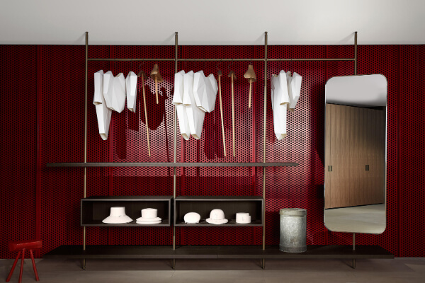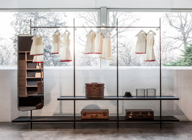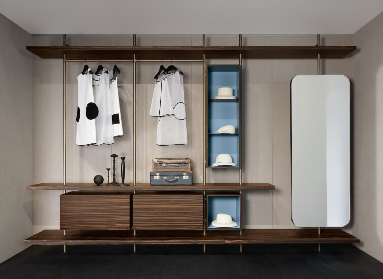 Porro's Boutique Mast can be configured to fit in any space. This wall-mounted system has a height that ranges from a minimum of 200 cm to a maximum of 290 cm. Its width depends on your preferences. The number of components you wish to attach to the upright structures also vary. You may place any number of drawers, shelves, and open cabinets in its form. Hangers and mirrors are also an option for additional components for the wall system. This product can be placed in your home's walk-in closet or in a fashionable boutique.