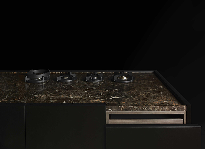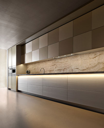 As a representative solution, Checkers designed by Armani and produced by Dada an Italian Kitchen manufacturer, is ideal as it is an exquisite open kitchen. Here, the natural stone top combines with precious natural wood, exclusive lacquers, and back-painted, ridged, textured glass. An LED light in the base of the wall units and countertop emphasizes the exquisiteness of the materials and enhances their variegated textures.