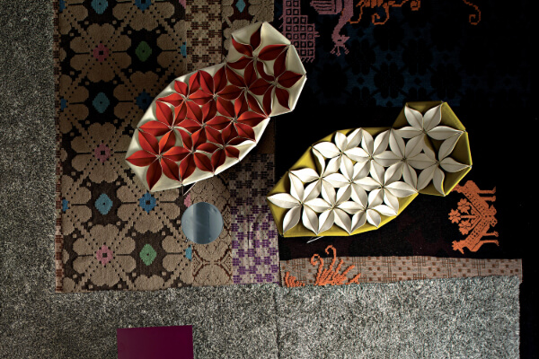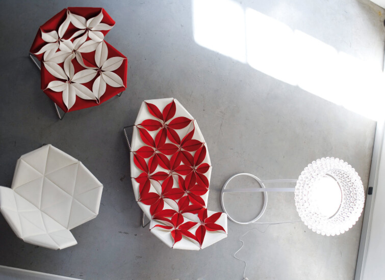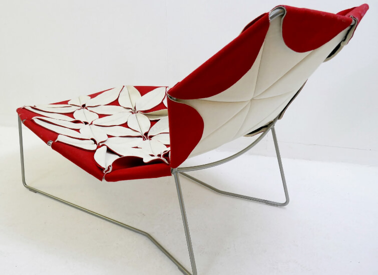 The beautiful upholstery of the Moroso Antibodi Daybed is but one of its exceptional qualities. The Antibodi's upholstery consists of a geometric patchwork of fabric circles sewed adjacent to the inscribed triangle. This self-supporting two-toned cover bonds to polyurethane foam and technical mesh, providing the petal-like cushioning for this beautiful daybed. These double-sided petals create a structural and padded element, which connects to the stainless steel frame. The upholstery features a split personality: welcoming and feminine when the petals face upwards, firm and dignified when the petals face down.