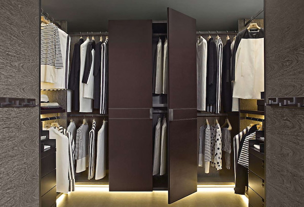 The choice of materials and their use are studied down to the smallest detail, such as the metal handles in contrast with leather details and the visible stitching on the doors or the precious upholstery used for the various interior accessories of the B&B Italia wardrobe.