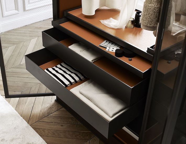 Even the composition of the internal elements can be customized in the way you prefer. Trays, colonial leather hanger tubes, drawer units, shelves and a complete range of accessories offer ample modular solutions and can be combined according to one's needs. Discover how to configure your Eracle by Maxalto by reading our article on luxury wardrobe accessories.