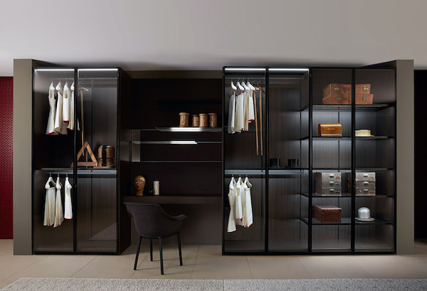 The main feature of Porro Storage system is the wide range of hinged doors. From materials, transparent or opaque, to the various types of handles, it is possible to create a unique wardrobe. There are in fact ten types of doors, each matched to a different type of handle: flat, techno, profile, scoop, iron, riff, 32S, block, eco-leather, leather.