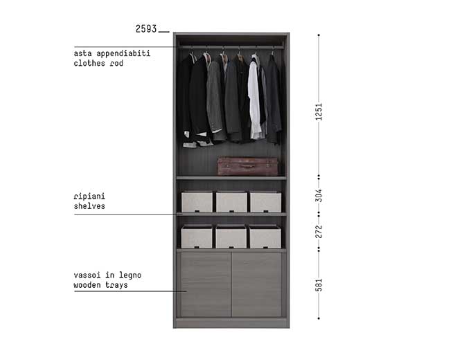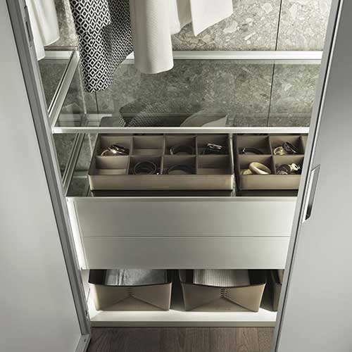 Shelves, clothes hanger rods and drawer units are the basic accessories to be composed at will. The same variety of choice applies to the finishes as well. The drawers, for example, in veneered wood, can be in various colours and finishes with fronts and sides also in glass. You can also customise the clothes hanger rod in white, cuve, black or ash metal. All details that contribute to define the quality and design of a luxury wardrobe.