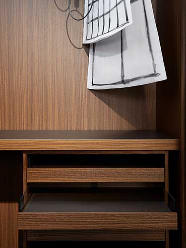 Everything for an impeccable organization that allows you to organize both men’s and women’s wardrobes, each accessory comes with fine finishes. Like the pull-out shelf and divider in imitation leather or the container in walnut essence. High quality finishes such as the suspended chest of drawers with leatherette top or mirror finish. Small details that embellish the design of the luxury wardrobe.