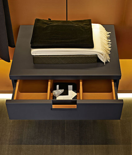 Functional shirt holders to be placed on floor-standing or suspended drawer units and convenient pull-out hangers, as well as a retractable mirror. The finishes of Gliss Master are also refined. Like those on the top of the Master drawer units, in transparent glass and aluminium painted Pewter and Bronze or the shelves for accessories such as tie holders and jewellery holders with ruby and grey “eco skin” finishes.