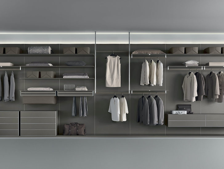 With its sophisticated and refined design, Rimadesio Abacus is a walk-in closet system that is consistent in every detail, from the accessories to the led lighting system present in the lower part of the shelves and integrated in the top part of the wall panels.