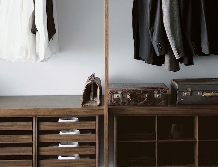 The essential and geometric lines of this modular closet system are animated by the internal equipment, which enrich and make this storage space unique.