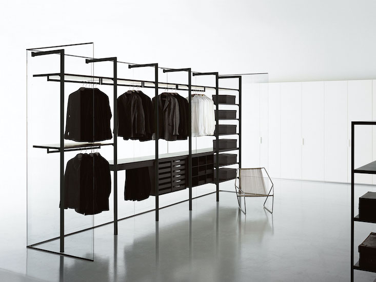 Porro Walk in Closet consists of a series of exposed mullions and transoms that become the only load-bearing elements of the structure. The horizontal cross beams, available in different standard sizes, and the vertical uprights, which can be positioned side by side, give the possibility of creating extremely flexible and light compositions.