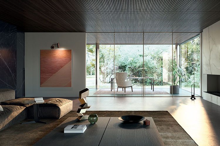 In terms of sliding doors, the Rimadesio collections stand out as one of the best Italian door manufacturers made in glass. The Velaria model, for example, is composed of a thin structural profile in aluminum and custom panels.