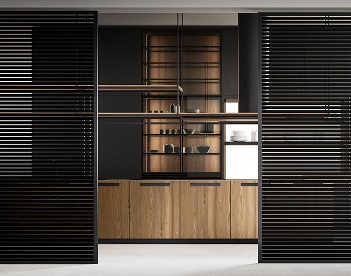 Another interesting typology is doors built into the wall paneling, ideal for creating a concealed effect, both in classic spaces such as Boiserie Avenue and modern and minimal like Boiserie. In the Lualdi collections, there are also sliding glass doors with clean lines such as Koan, with glass panels and wooden slats, and L7 PLUS, a sliding system to lightly separate spaces.
