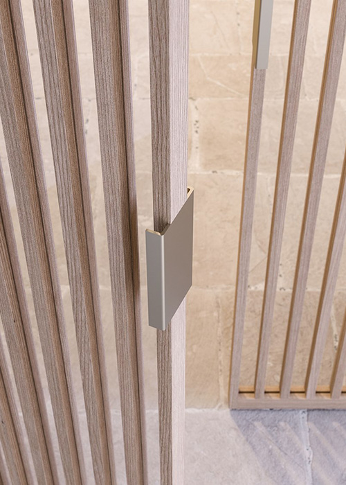 The Adl Line Door gives character to the environment, thanks to a series of aluminum cross-pieces that are applied on both sides of the glass, helping to partially hide the rooms without sacrificing light and shadow effects. With the same aim of obscuring, the Levante Door is composed of inclined elements with a triangular section designed to allow the passage of light while at the same time limiting visibility.