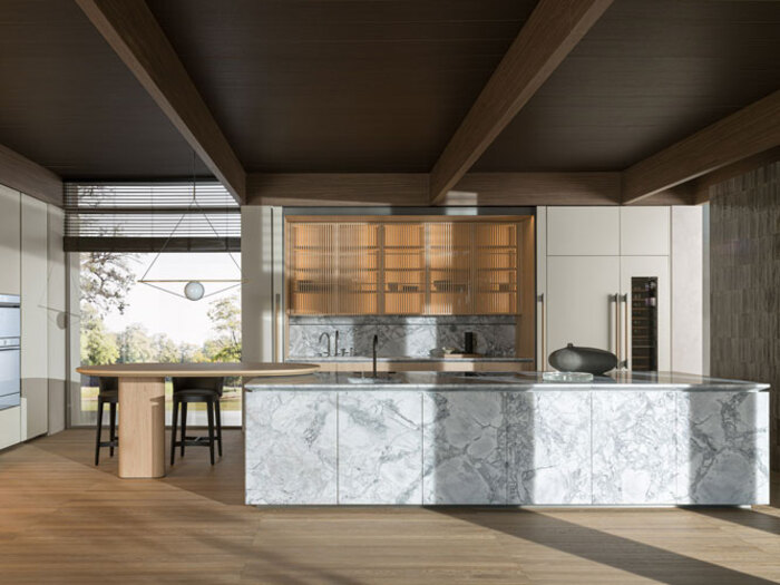 The essential and monolithic design of Intersection employs only natural stone, taking advantage of its mesmerizing and captivating texture, to create a kitchen that must also be fully functional.