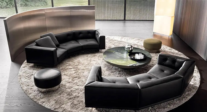 For example, let’s take a look at this composition, where our attention is clearly claimed by the interplay of geometries generated by the two Dylan sofas, the circular table, and lastly by the rug that accommodates the composition like the canvas of a painting.