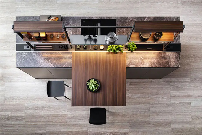 Designed by architects such as Ferruccio Laviani and Nicola Galizia, Molteni&C‘s kitchens often use wood, especially exploiting the texture of surfaces to define interesting graphic patterns, which streamline the space and help create a calm, relaxed atmosphere.