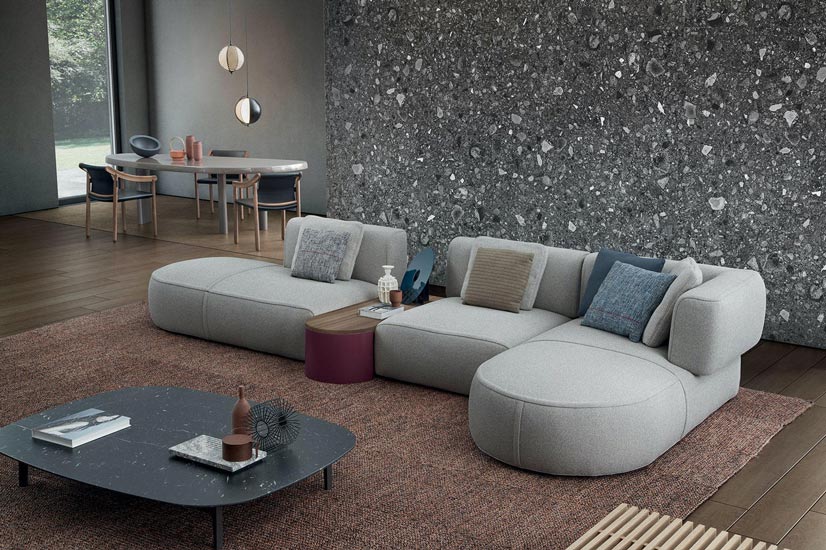 Patricia Urquiola stays true to her love of rounded forms with the Super Beam sofa designed in 2017. Available in both linear and L-shape compositions, the modular system can be combined with upholstered elements, low tables and a free-standing chaise longue. Our proposal is the Super Beam three-seater with a width of 360cm (141.7 inches), whose starting price is 9.110 Euro in fabric and 11.550 Euro in leather. Alternatively, an L-shape configuration with a width of 410cm (161.4 inches) and a length of 160cm (63.0 inches) has a starting price of 10.640 Euro in fabric and 14.130 Euro in leather.