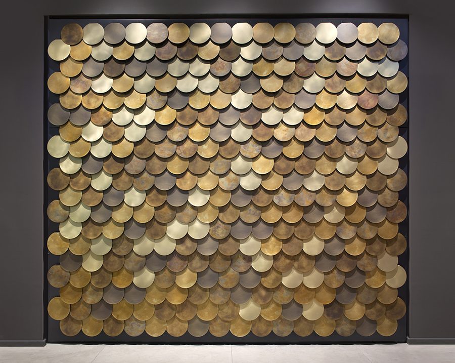 This way, in addition to design furnishings, interesting solutions for interior finishes can also be found in the DeCastelli portfolio. Like Marea, created through superimposing oxidation processes on brass, copper, and iron or Circle Wall, a spectacular overlapping of round modules that become a wallcovering system that plays on the warm nuances of brass.