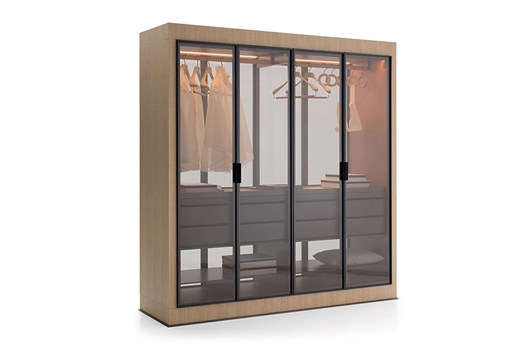 Dandy by Lema, for example, is a 4-season wardrobe available with a black metal outer frame and a wide selection of panels: transparent glass, reflective bronze glass, lacquered glass in 10 colors, bronze glass with fabric screen-printing, and decorative fabric upholstery. Dandy can be reduced in height, width, and depth, and features a wide range of internal equipment to create a variety of combinations to suit every need.