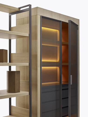 The contemporary wardrobe is no longer just an accessory that remains confined to the corner of the room, but an important piece of furniture that intermingles with the other elements of the home. It can also act as a partition between two areas in the bedroom, for example. Eracle by Maxalto allows you to achieve this with ease thanks to the double-sided version that is open on both sides. The wardrobe mimics the style of 1950s display cabinets.