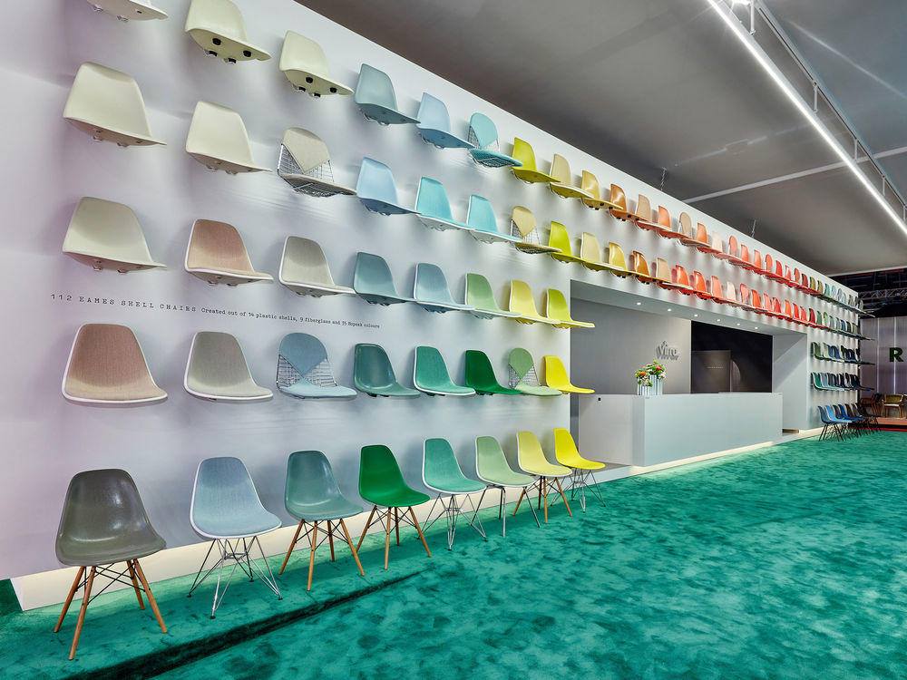 The historic Sag80 showroom displayed a tribute to Vitra designs. Antonio Citterio’s Grand Sofa and Vlinder sofa by Hella Jongerios were featured. A rainbow of Vitra’s Eames Plastic Chairs and Eames Fiberglass Chairs provided a splash of color. At Salone del Mobile 2019, Vitra introduced four ambiences with new products by Hella Jongerius, Konstantin Grcic, Antonio Citterio, Ronan & Erwan Bouroullec, and Edward Barber & Jay Osgerby. The entrance included a colorful series of the 1950 design of Eames Plastic Chairs in 14 new hues and Eames Fiberglass Chairs in dark ochre, light ochre, and red.