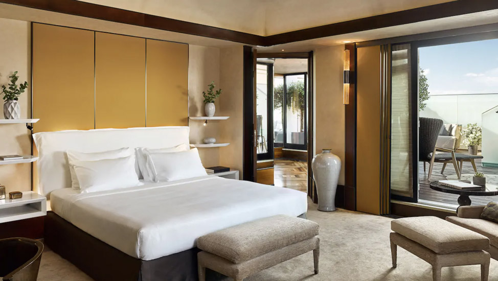 Inside, guestrooms are coloured in muted grey, beige and cream tones. Montecatini aluminium chairs by Giò Ponti are complemented with lighting solutions by Achille Castiglioni. Meanwhile, the restaurant’s interior showcases contemporary design elements like signature plaster horns, curved platform seating and a beautiful central lounge.