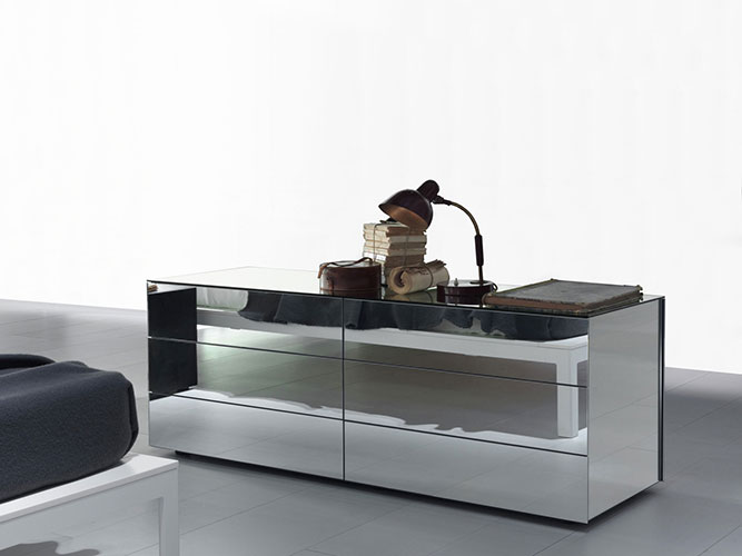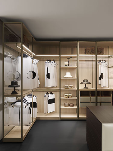 For an enclosed walk-in closet, there is the Dressing Room Storage, a customizable option equipped with shoe rack and illuminated shelves.‎ Dressing Room can be combined with the Acquario chest of drawers, named such because it is made from transparent crystal with brass profiles.