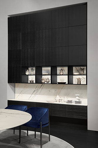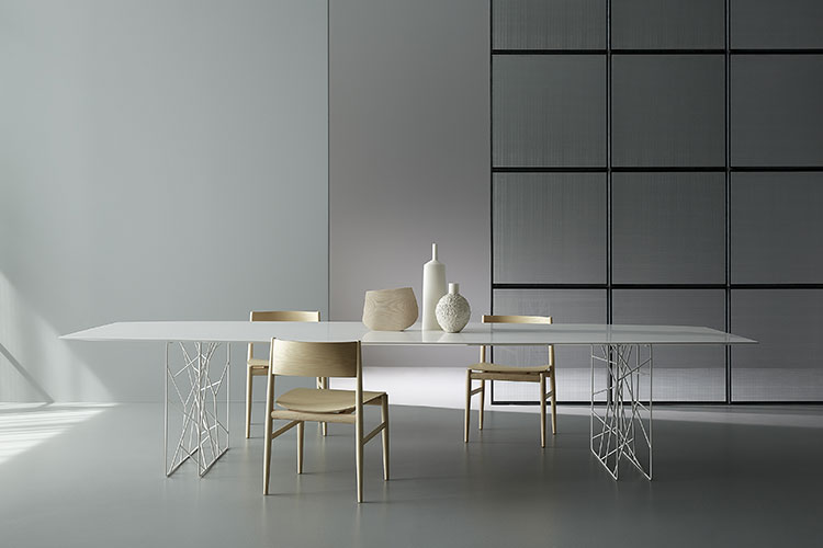 Many of the Porro furniture and systems in the Porro catalog are by Piero Lissoni, whose products define the style of the brand. Examples include the Metallico table with its clear, clean lines, in 12 mm aluminum sheet – used by our team in the formal dining room of this interior design project in Jeddah – and makura, the double bed in leather or fabric upholstery with padded headboard. There are also Neve, the elegant ashwood chair with tapered legs and curved backrest, and the essential Boxes, the chest of drawers with crystal lacquer.