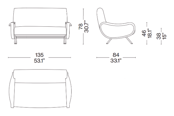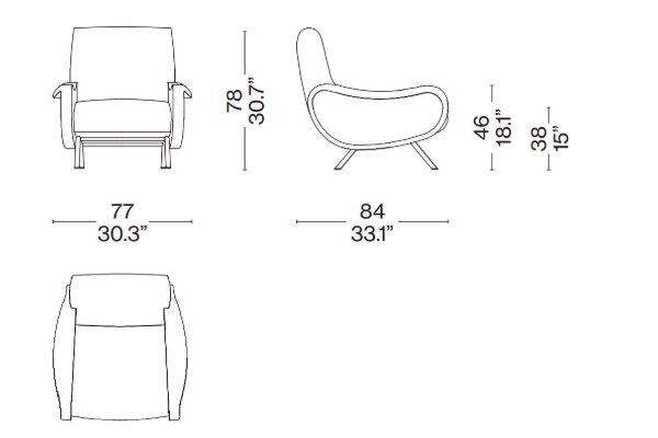 Marco Zanuso Lady Chair was initially conceived as a seat for car interiors, but the Italian designer decided to produce this armchair also for domestic environments, always using the  process for mass-produced pieces. This was the birth of Cassina 720 Lady, which is currently available in these dimensions: width 77 cm, depth 84 cm and height 78 cm. The armchair has a large seat and comfortable backrest and armrests.