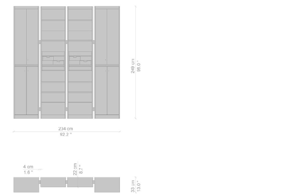 Cassina's Rialto Cabinet comes in four versions and measurements: a single unit of the Rialto measures 22x55x249 cm or 33x55x249 cm. The double version comes in 22x114x249 cm. A three-unit variant will measure 22x173x249 cm, while a four-unit cabinet with doors measures 22x232x249 cm. Regardless of measurements, the Rialto can occupy any vertical plane within your home. This cabinet system gives any area a beautiful and efficient storage solution that will add a touch of practicality and style to the location that it inhabits.