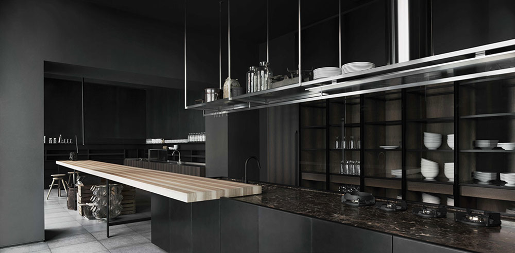 As a representative solution, Checkers designed by Armani and produced by Dada an Italian Kitchen manufacturer, is ideal as it is an exquisite open kitchen. Here, the natural stone top combines with precious natural wood, exclusive lacquers, and back-painted, ridged, textured glass. An LED light in the base of the wall units and countertop emphasizes the exquisiteness of the materials and enhances their variegated textures.