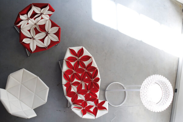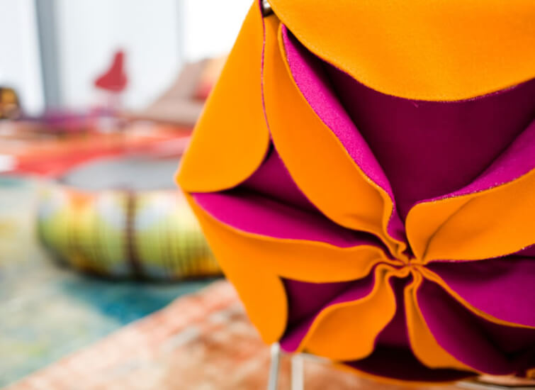 The beautiful upholstery of the Moroso Antibodi Daybed is but one of its exceptional qualities. The Antibodi's upholstery consists of a geometric patchwork of fabric circles sewed adjacent to the inscribed triangle. This self-supporting two-toned cover bonds to polyurethane foam and technical mesh, providing the petal-like cushioning for this beautiful daybed. These double-sided petals create a structural and padded element, which connects to the stainless steel frame. The upholstery features a split personality: welcoming and feminine when the petals face upwards, firm and dignified when the petals face down.