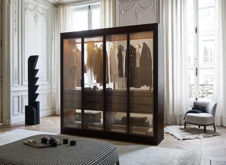 The doors of Eracle Maxalto are the transparent elements of the volume: made up of a coupled double crystal, they enclose a high-tech fabric inside. These doors, which elegantly try to conceal the contents of the wardrobe, are framed by bronzed nickel profiles. There are numerous references in this wardrobe, such as the one linked to the oriental world: the refinement of hiding at first glance the red lacquered interiors, which reveal themselves only at a later moment.