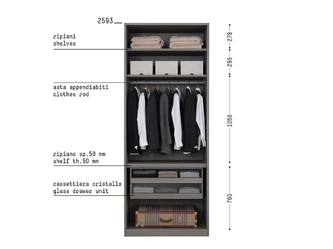 Shelves, clothes hanger rods and drawer units are the basic accessories to be composed at will. The same variety of choice applies to the finishes as well. The drawers, for example, in veneered wood, can be in various colours and finishes with fronts and sides also in glass. You can also customise the clothes hanger rod in white, cuve, black or ash metal. All details that contribute to define the quality and design of a luxury wardrobe.