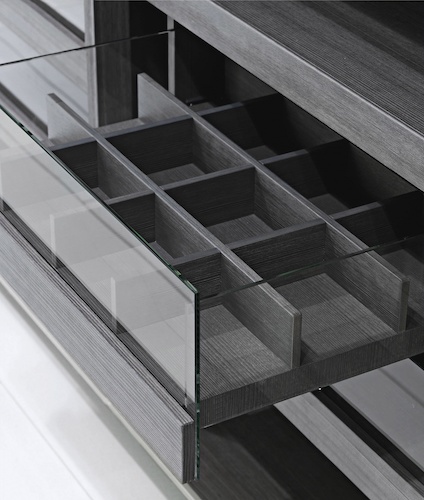 Functional shirt holders to be placed on floor-standing or suspended drawer units and convenient pull-out hangers, as well as a retractable mirror. The finishes of Gliss Master are also refined. Like those on the top of the Master drawer units, in transparent glass and aluminium painted Pewter and Bronze or the shelves for accessories such as tie holders and jewellery holders with ruby and grey “eco skin” finishes.