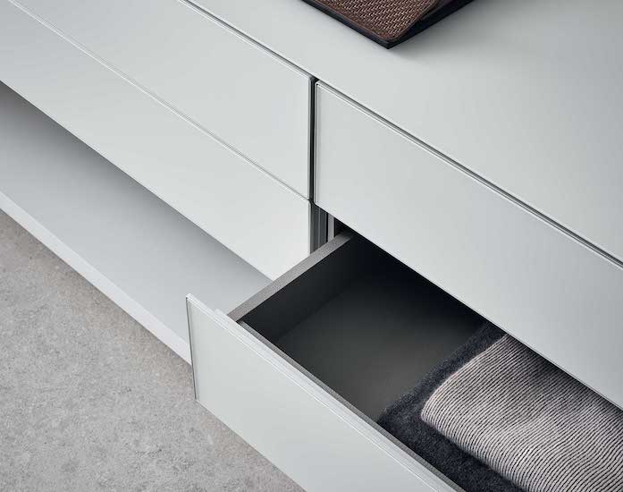 The internal equipment, such as shelves and pull-out shelves, can also be in leatherette in various colours, while the interiors of the drawer units can be upholstered in leather. As for the profiles of the panels, shelves or drawers, the plinths but also the garment rails, you can choose between stainless steel, aluminium or black painted metal.