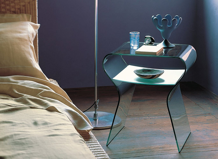 The Fiam Charlotte De Nuit Nightstand symbolizes a high level of glass manipulation. Fiam's production methods allow glass to display characteristics that aren't readily available for the material. Designed by Prospero Rasulo, the Charlotte De Nuit transcends its origins to become a product worthy of your attention. Glass is usually more fragile in a bent state, but thanks to Fiam's expertise, the 8 mm-thick top of the Charlotte De Nuit can support weight up to 12 kg while the additional shelf can support 4 kg as well, making this product a bedside necessity for your home.