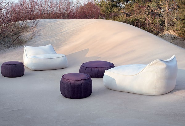 The Paola Lenti Float series includes an easy chair, chaise lounge, and sofa. The different options maintain their shape with a polyester fabric casing padded polystyrene.