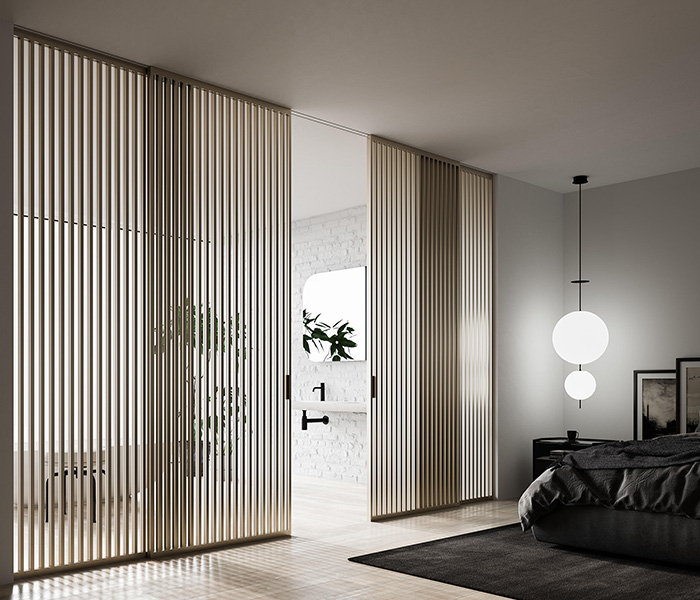 Another interesting typology is doors built into the wall paneling, ideal for creating a concealed effect, both in classic spaces such as Boiserie Avenue and modern and minimal like Boiserie. In the Lualdi collections, there are also sliding glass doors with clean lines such as Koan, with glass panels and wooden slats, and L7 PLUS, a sliding system to lightly separate spaces.