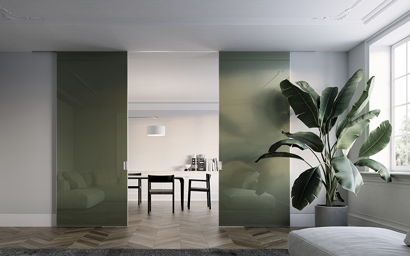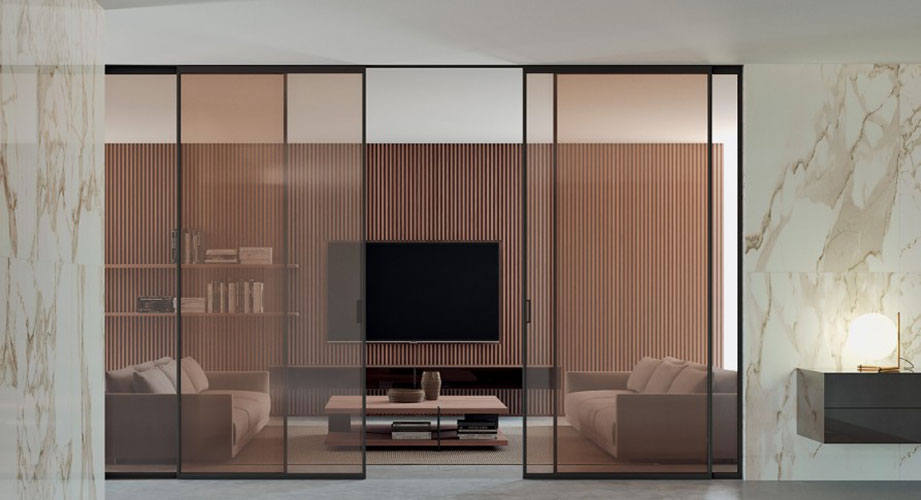 In terms of sliding doors, the Rimadesio collections stand out as one of the best Italian door manufacturers made in glass. The Velaria model, for example, is composed of a thin structural profile in aluminum and custom panels.