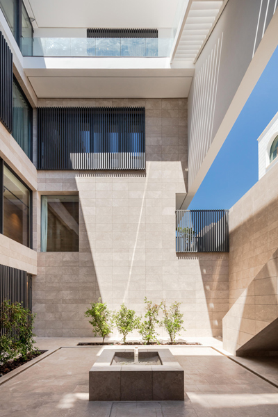 The interior design is a complex balance between distinctly modern sensibilities, with its essential curved lines, and Middle Eastern aesthetic heritage, manifesting in the mosaics on the first floor and the chandeliers reminiscent of mosque motifs.