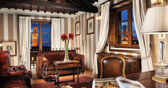 The Continental’s top-of-the-line hospitality is undoubtedly the Panoramic Suite, on the top floor of the building, in the two-story turret that stands out for its incomparable view of Siena and the surrounding countryside.