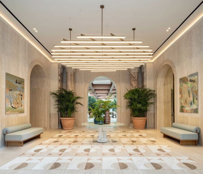 An estrangement achieved through a careful balance between classic and modern, continuously dialoguing with the aesthetics and culture of Rome, through the mosaic floors or through the cocciopesto of the walls, reminiscent of ancient colonnades.