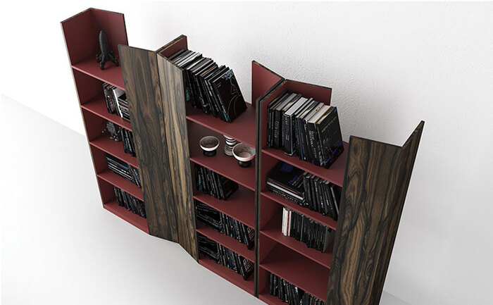 If we think of the Vertigo free-standing bookcase, it is impossible not to appreciate its fragmented line and this continuous play of recesses and depths, which give its design an extraordinary dynamism, clear and functional.