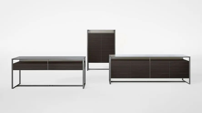 Sideboard, bar cabinet, console and three different tables make up RIALTO, a whimsy that plays with the brightness and transparency of the furniture, making it seem to be suspended in the void.