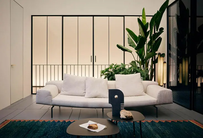 At the Salone del Mobile, Flexform presented a sophisticated yet informal lifestyle, enhanced by color contrasts, wide spaces and essential shapes… all of these softened by light dancing on fabric surfaces.