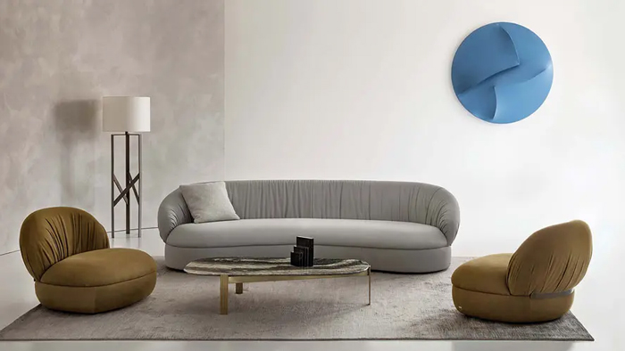 For example, let’s take a look at this composition, where our attention is clearly claimed by the interplay of geometries generated by the two Dylan sofas, the circular table, and lastly by the rug that accommodates the composition like the canvas of a painting.