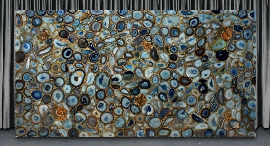 Another name that stands out for its potential contributions to the interior design business is Antolini, whose proposals find use in luxury and scenographic spaces. The Precioustone Collection, for example, is perfect for creating effects and patterns on unexpected surfaces thanks to the 100 varieties of precious gems such as amethysts, quartzes, jaspers, and agates. These stones, the translucent varieties in particular, can also be backlit, thus creating inimitable and original chromatic atmospheres.