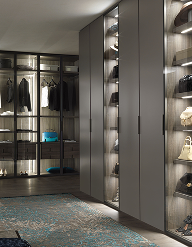 Dandy by Lema, for example, is a 4-season wardrobe available with a black metal outer frame and a wide selection of panels: transparent glass, reflective bronze glass, lacquered glass in 10 colors, bronze glass with fabric screen-printing, and decorative fabric upholstery. Dandy can be reduced in height, width, and depth, and features a wide range of internal equipment to create a variety of combinations to suit every need.