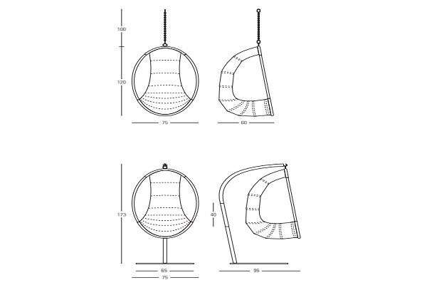 The Swing's base is dependent on your preference. The floor-based metal support structure is the correct option for a more stable version of this item. The total measurement for the floor version is at 173x75x95 cm. In case you require more movement for the Swing, you may opt for the ceiling-based variant. In this option, the actual seat measures 120x75x60 cm. The standard chain length for this option is at 100 cm, but you can customize this element according to your needs as well.