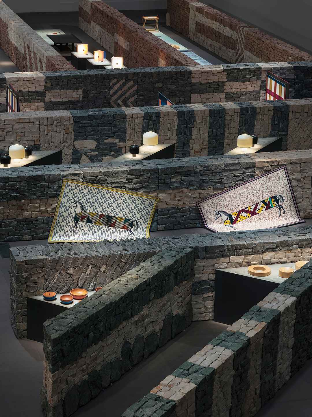 Hermès showed a unique exhibit this year at La Pelota in the Brera Design District. The collection was brimming with natural, earthy materials such as granite, porcelain, bamboo, and leather. Tomás Alonso’s series of lamps were made with bamboo, paper, and aluminium. Gianpaolo Pagni’s “Hippomobile” consisted of cashmere with beaded embroidery. British designers Barber & Osgerby introduced Halo and Hecate, lamps made of porcelain or granite. Joséphine Ciaudo was inspired by the silk jackets of jockeys in creating leather patterns atop mahogany boxes. The tactile nature of these objects was accompanied by grey sand below most products.