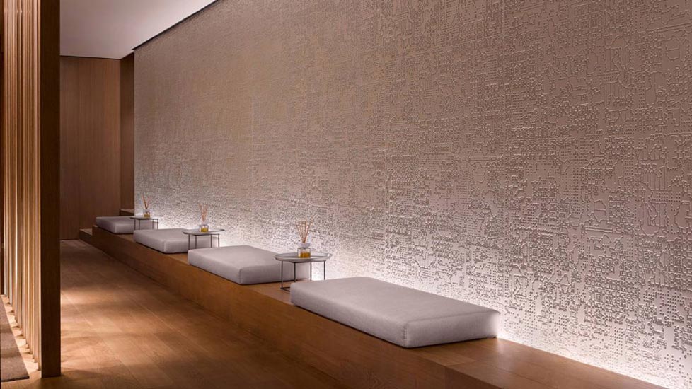 Taken from the Armani/Casa collection, the furnishings in the hotel share the signature design philosophy but have been tailored to reflect the mood of the palazzo. Elegant linear sofas covered in sophisticated fabrics sit aside backlit wooden bed heads in rooms clad with Silk Georgette, a smooth limestone from Asia. Meanwhile, on the seventh and eighth floors, where all the public areas are concentrated, the Armani/Lounge boasts a double height ceiling and views over the skyline.